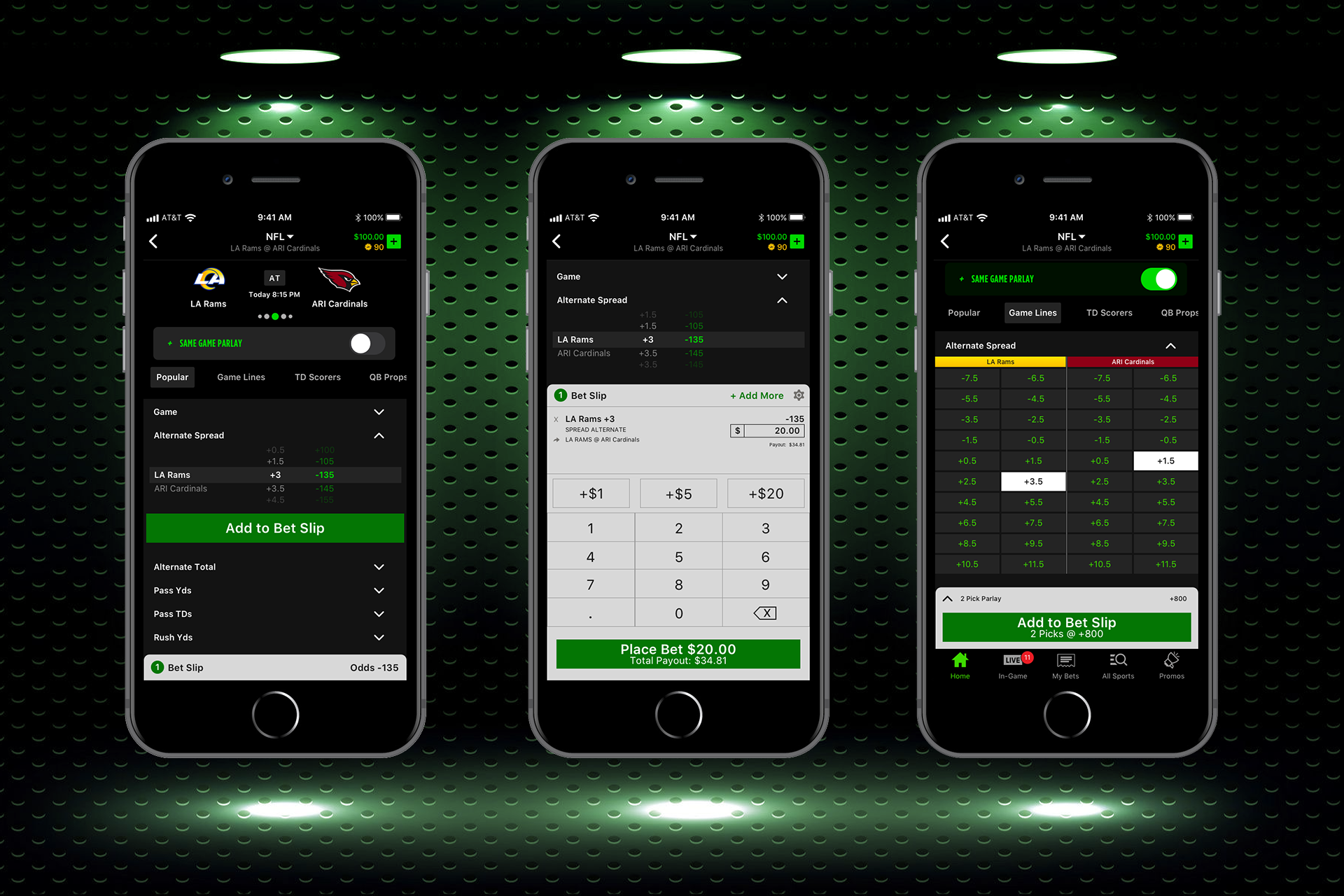 After using the DraftKings Sportsbook application often on mobile, I wanted to go outside the box and create a new wheel selector for choosing alternate spreads. Another solution to minimize scrolling while keeping the same layout, maximize screen space by hiding team logos until scrolled down.