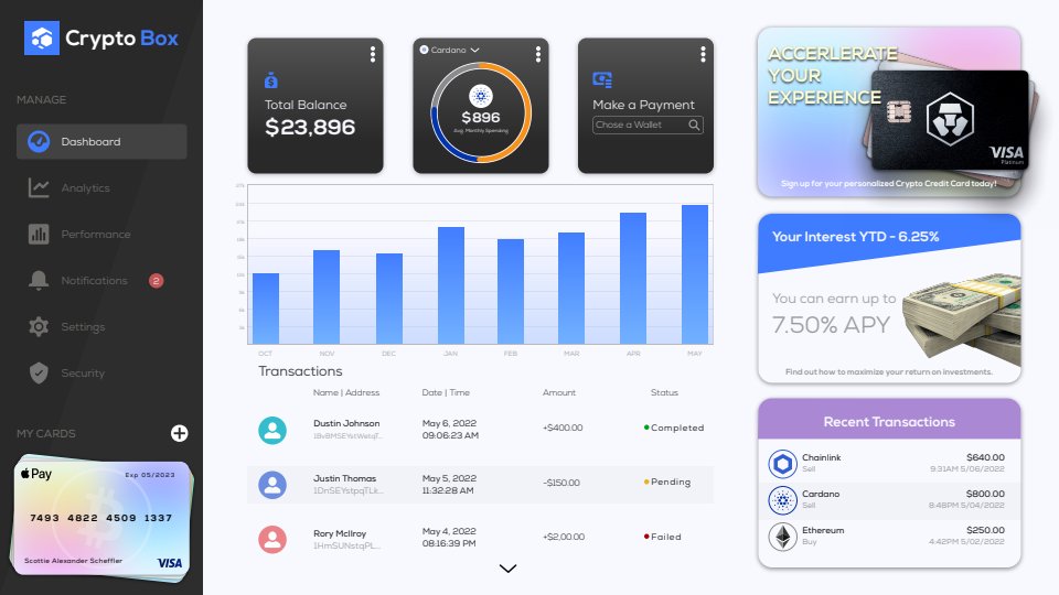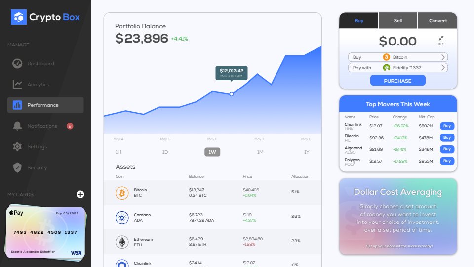Crypto Box is a concept that bridges the gap between banking and cryptocurrency. At the moment, controlling multiple wallets and sending/receiving coins as payment is a burden. This one stop shop allows you to merge your bank account in addition to every coin you own, which makes money management much easier. Performance and Analytics are key components to a successful portfolio which would all be available within Crypto Box's Dashboard.