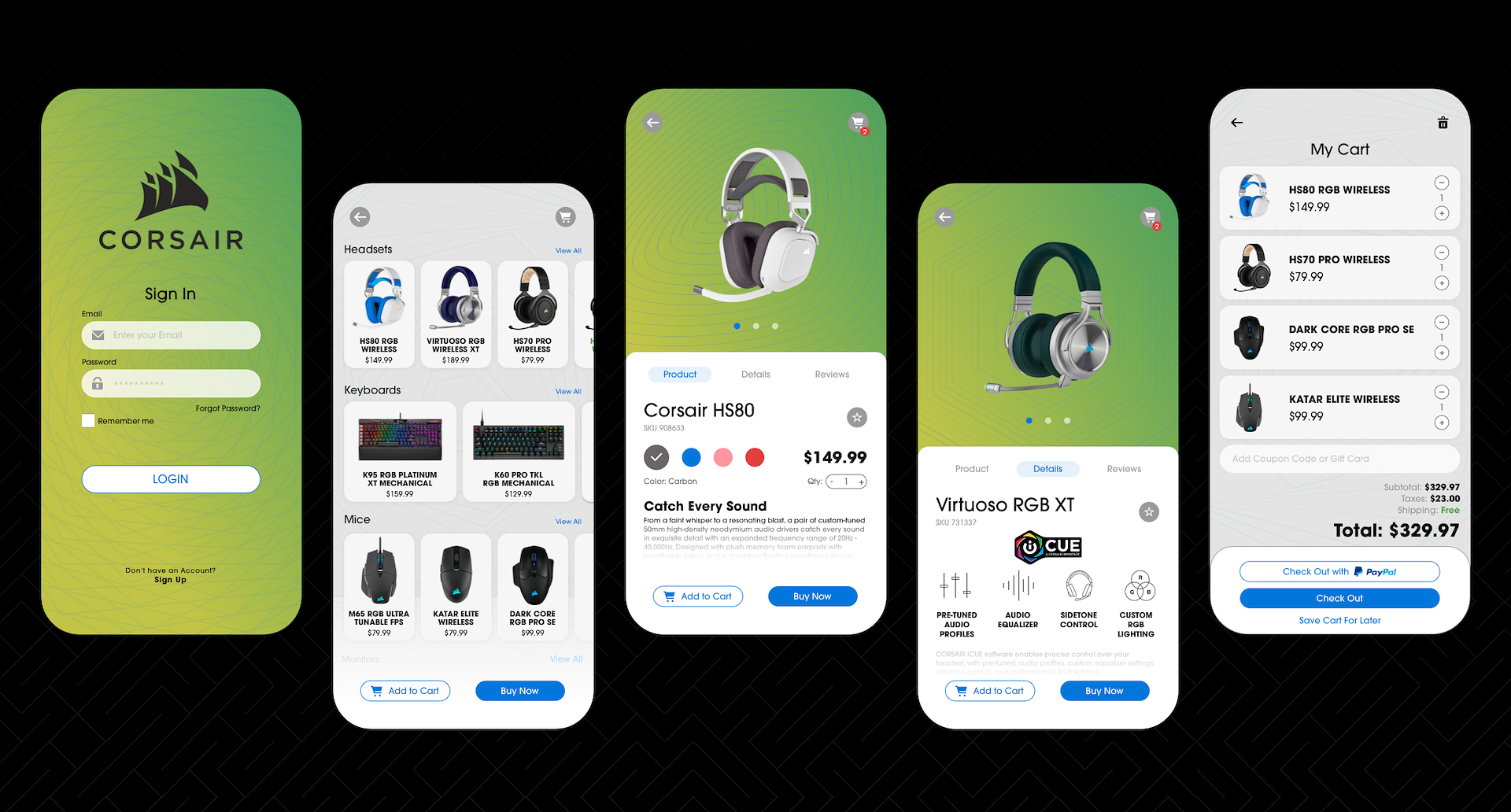 Corsair has a wide variety of products that span from Gaming Gear, PC Components, Peripherals, and Software. I have developed a central gaming hub that allows users to build a cart and purchase everything they need from their mobile device.